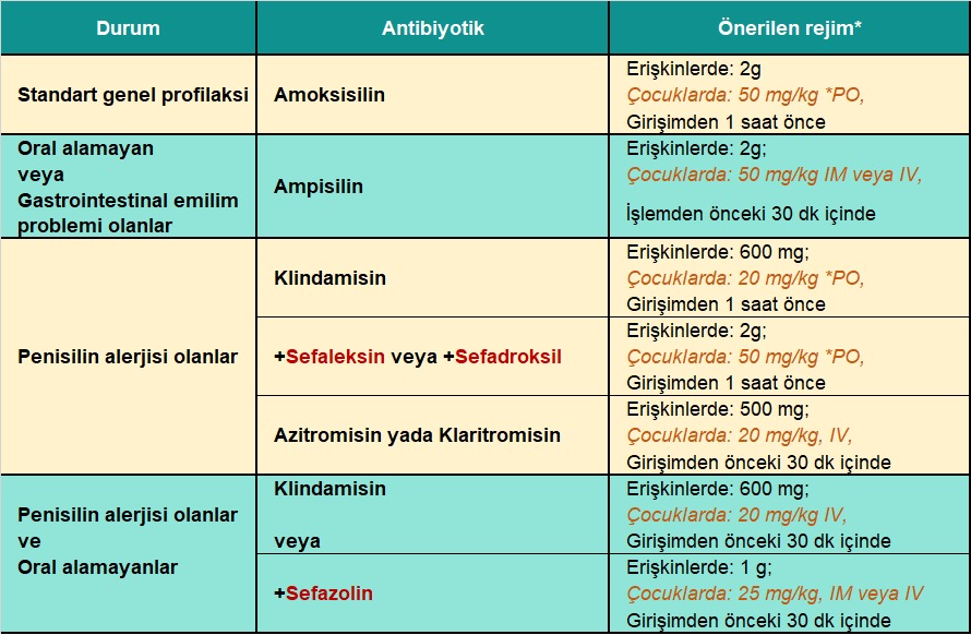 Erişkinler için: Girişimden 1–2 saat önce 2 gram amoksisilin (örn. Klamoks 1 g tablet × 2)